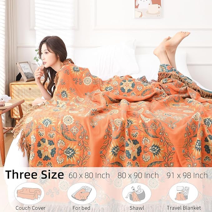Boho Throw Blanket for Bed - 100% Pure Cotton Ultra Soft Rustic Quilt - Farmhouse Decor Bed Blankets, All Season Rustic Throw for Sofa Couch Chair(80''x 90'', Boho)
