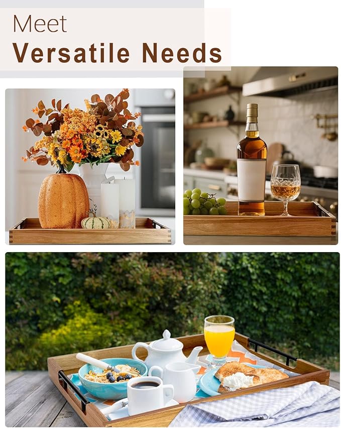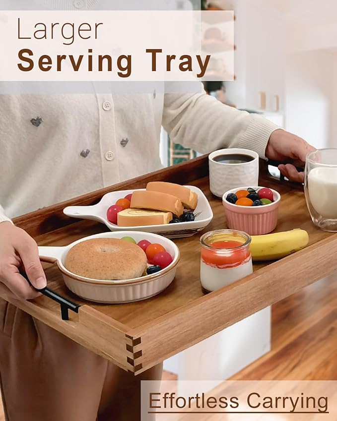 • PREMIUM ACACIA WOOD – Crafted from high-quality natural wood, this wooden tray is sturdy and durable. The unique dovetail joinery ensures long-lasting use, while the clear paint finish makes maintenance effortless.