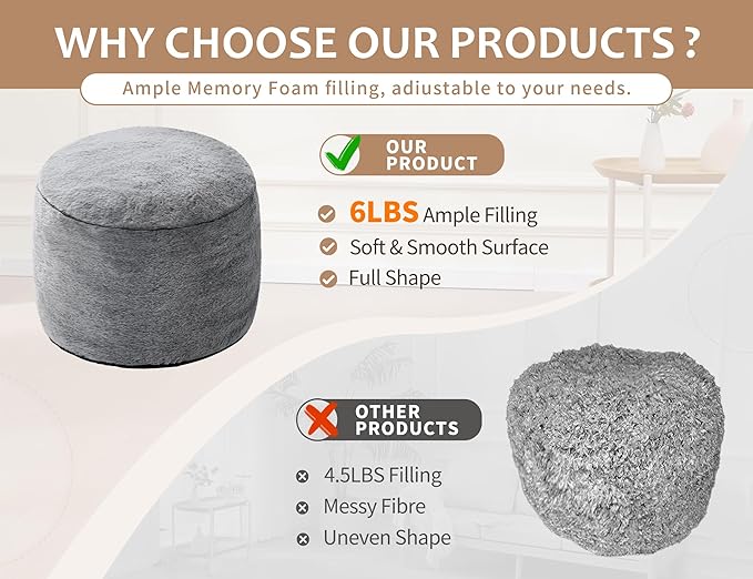 - Filling of Living Room Ottoman: The foot stool for couch are compression packed for ease of shipping, please pat, shake and knead the boho bean bag footstool's cushions after applying the plush cover and allow 48 to 72 hours for the grey foot rest to fully expand.