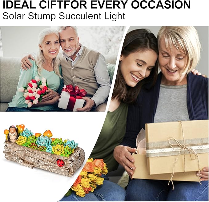 - [Creative Garden Decor] Elevate your garden with our stump succulent statues solar light! In the quiet of the night, these solar-powered succulent lights, once turned on, seem to come to life as if by magic. These charming Hedgehog, Ladybug, Mushroom not only light up your outdoor space but also add a touch of whimsy. Brighten your nights with eco-friendly magic!