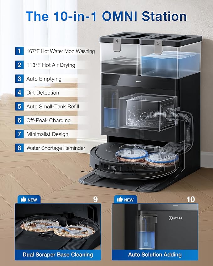 - 10-IN-1 OMNI STATION – HANDS-FREE MAINTENANCE - The OMNI Station handles all maintenance—167°F hot water mop washing, 113°F hot air drying, auto dustbin emptying, water refilling, and dirt detection. It even auto-dispenses cleaning solution, ensuring a deep, hands-free clean every time.