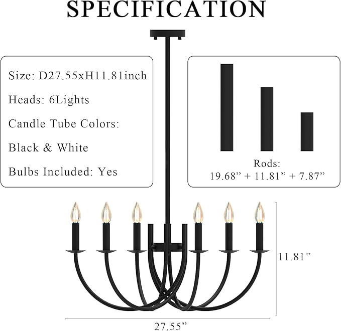 • 【Specification】 Size: D27.55xH11.81inch / D70xH30cm. The Length of Pendant Rods: 39.37inch / 100cm (Adjustable). The Rods: 7.87inch + 11.81inch + 19.68inch. Heads: 6Lights. Color: Black. Metal Tubes Color: Black + White (Includes Black and White Colors Metal Tubes). Lamp Socket: LED E12. Emitting Color: Warm White 3000K. Bulbs Included: Yes. Wattage: 18W.