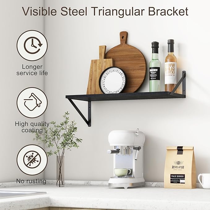 - 【FARMHOUSE RUSTIC WALL SHELF】These floating shelves are made of premium engineered wood board and visible triangular bracket. The rustic wooden grain surface add character and warmth to any modern or traditional interior with these deep floating shelves, contrast shelves at staggering heights on the wall or mount side-by-side or in the corner for a clean streamlined look.