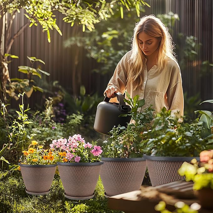 - 【Plant Pots With Drainage Holes & Saucers】These lightweight plastic flower pots come with multiple drainage holes in the bottom to allow excess water to flow out easily, and the planter's matching tray is perfect for collecting overflow water and soil spills. The 4 packs 8 inch garden pots creates a healthy living environment for your plants.
