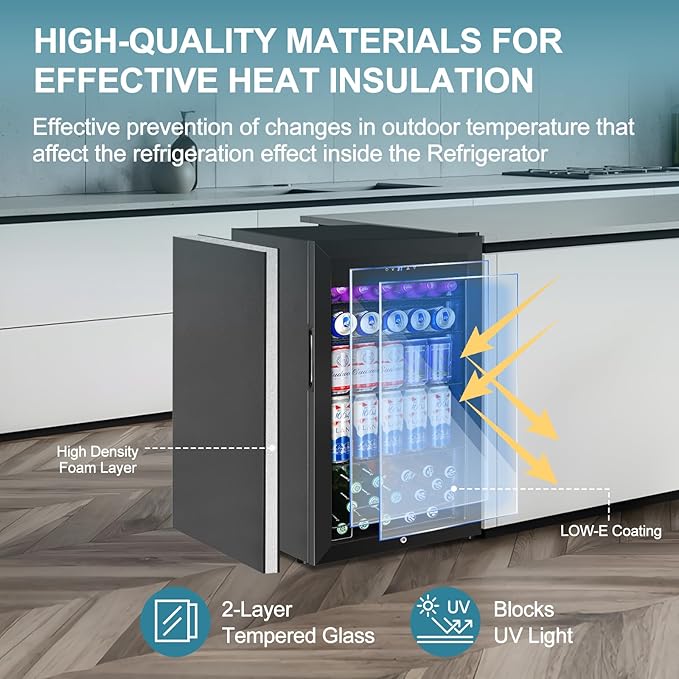- ADVANCED INSULATION & SUN PROTECTION MATERIALS: The small drink refrigerator uses a double-layer tempered glass door and Low-E coating to effectively block sunlight and maintain a stable internal temperature. The durable stainless steel body and high-density foam insulation provide excellent thermal protection, and the high-seal door gasket prevents cold air from escaping, ensuring energy-saving and continuous cooling.
