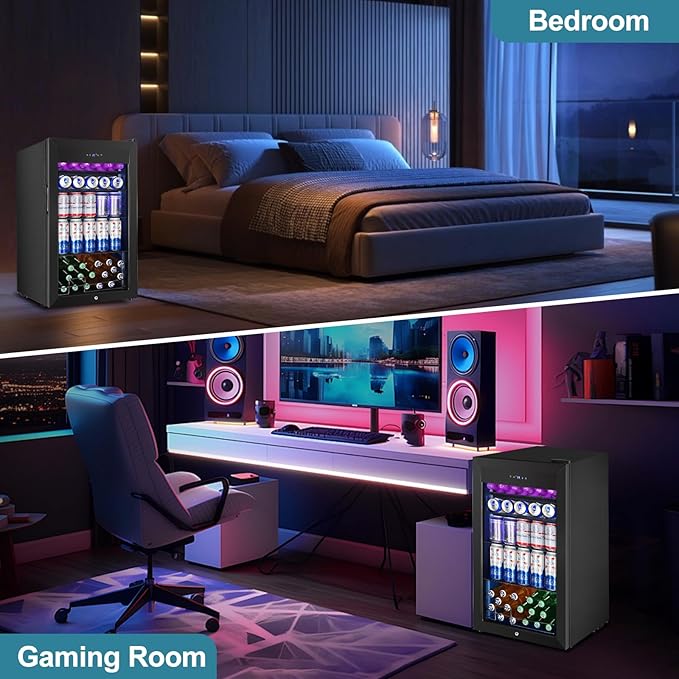 - POWERFUL COMPRESSOR & FAST COOLING TECHNOLOGY: Equipped with an advanced compressor and 360 °air circulation system, this beverage refrigerator ensures rapid and even cooling throughout the entire interior. The constant low temperature keeps your drinks chilled to perfection, ideal for quick refreshment anytime. Perfect for home theaters, kitchens, offices, RVs, dorm rooms, apartments, or gaming rooms, enjoy ice-cold beverages wherever you are.