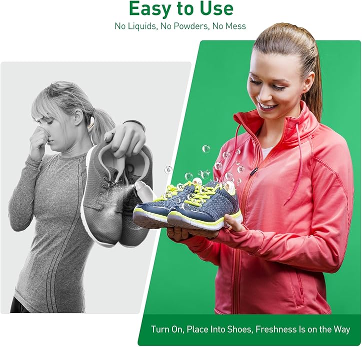 - Easy to Use: Simply turn it on and place it inside your shoes, it starts eliminating odors and shut off automatically-no sprays, no powders, no mess. Experience effortless freshness with zero residue left behind