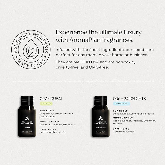 - TWO LUXURIOUS WATERLESS PLUG-IN DIFFUSER WITH 2 FRAGRANCES â The AromaPlan Authentic 2025 Upgraded Plug-In Diffuser uses advanced NT10x nanotechnology to transform liquid fragrance into dry, vaporous microparticles, evenly scenting spaces up to 500 sq ft without water or oily residue. This set includes 2 Plug Ins + 2 bestselling 25ml fragrancesâDubai & 24 Knightsâdelivering fresh, invigorating scents.