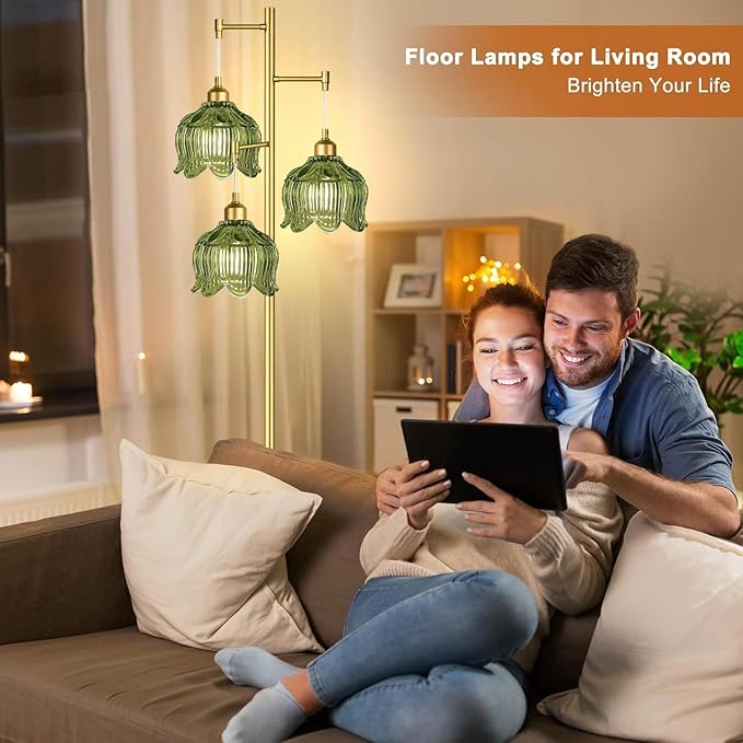 Gold Floor Lamp for Living Room,Bedroom,Mid Century Modern Standing Lamp Brass Tree 3 Light Tall Floor Lamps Vintage Retro Floor Lights Glass Green Flower Lamp Shade Farmhouse Boho Bohemian
