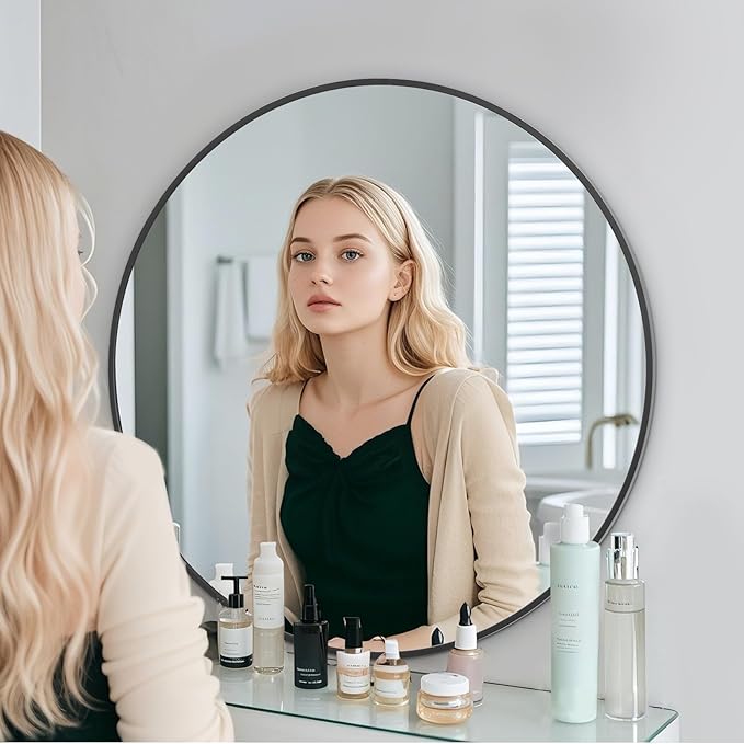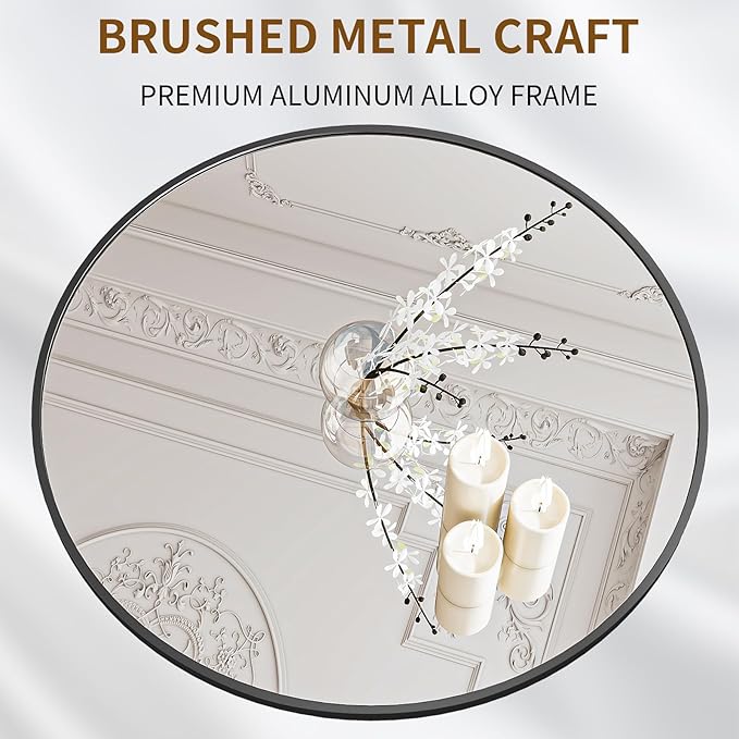 • Modern Brushed Frame Design: 40-inch black circle mirror is crafted of an aluminum alloy metal sleek frame, making it ideal for bathroom mirror, entrance mirror, vanity mirror, living room mirror