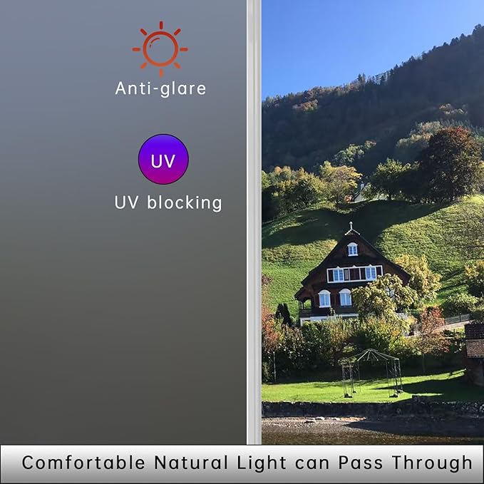 - ãUV ProtectionãGlass film for window privacy, shade window film can block 98% of ultraviolet rays, protect your eyes and skin from damage, and prevent furniture from fading. It allows natural light to pass through, controlling glare and blocking UV rays to create a more comfortable living space for you and your family.