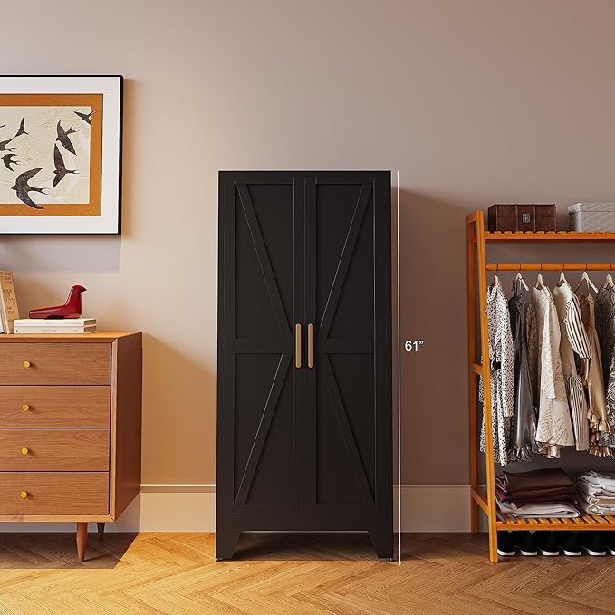 61" Tall Farmhouse Metal Pantry Cabinet, Kitchen Pantry Storage Cabinets with 2 Barn Door and Adjustable Shelves,Metal Pantry Storage Cabinet,for Kitchen,Laundry Room,Home Office,Kids Room (Black)
