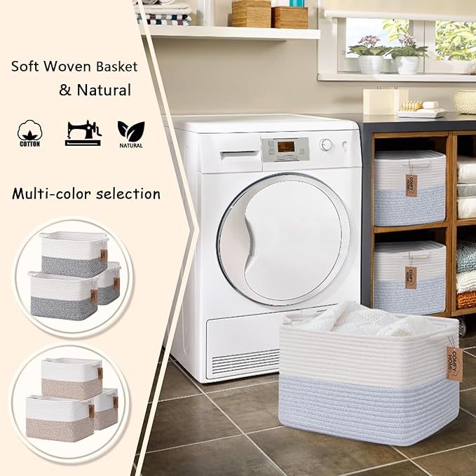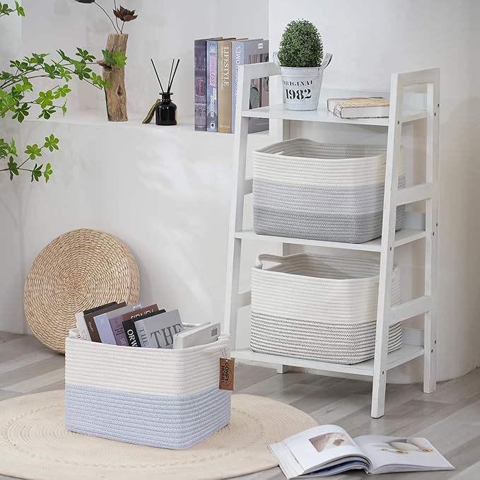- MEDIUM BASKETS FOR ORGANIZING: 13.5''Lx11''Wx 9.5''H, Cotton rope baskets can be used in baby room, kid’s room, nursery, living room, bathroom, office. And are very ideal for storing books, toys, clothes,towels. It's a great way to store them out of sight