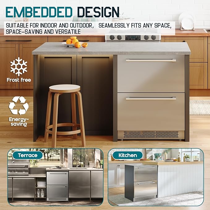 Albott 24 Inch Under Counter Drawer Fridge – Stainless Steel Beverage Refrigerator with Dual Drawers, LED Touch Control, Adjustable Storage, Frost-Free, Low Noise, 34-72℉, for Indoor or Outdoor Use