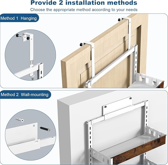 - 【Size and Load Bearing】The size of the whole shelf hanging door is: D6.3xW17.32xH73.23 inches;the size of the whole shelf on the wall is: D6.3xW17.32xH68.9. Please look at the other details in the picture. The bearing capacity of each layer of the hanging door is about 11.11 pounds and the whole shelf is about 88.88 pounds; each layer of on the wall is about 22.22 pounds and the whole shelf is about 177.76pounds. With 16 hooks improves space utilization and facilitates necessities in kitchen, bathroom or closets