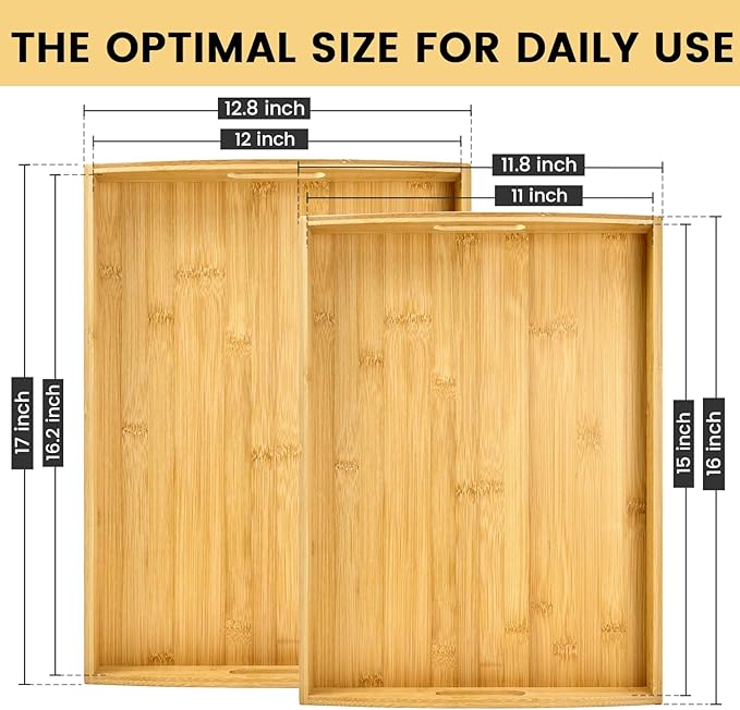 • TWO SIZES FOR PERFECT APPLICATION: One wood serving tray set comes with two sizes. The large one (17" x 13" x 1.5") is great for display or appetizers. The small one (16" x 12" x 1.5") suits small spaces or coffee tables and is stackable for saving space