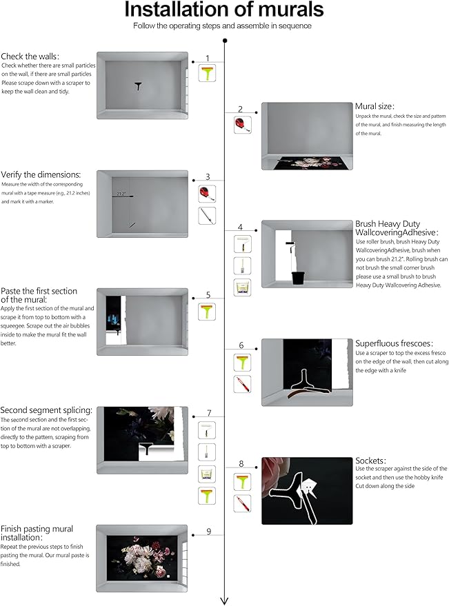 • Construction Installation: Each part of the mural is marked with a serial number underneath, no overlap, direct docking, in order. (Please refer to installation instructions)