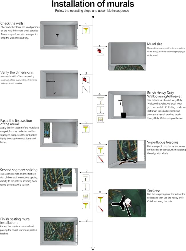 • Construction Installation: Each part of the mural is marked with a serial number underneath, no overlap, direct docking, in order. (Please refer to installation instructions)