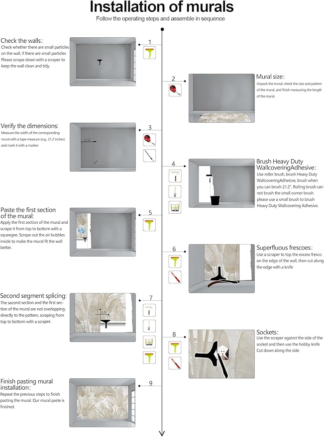 • Construction Installation: Each part of the mural is marked with a serial number underneath, no overlap, direct docking, in order. (Please refer to installation instructions)