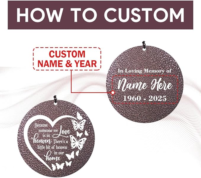 - ๐Personalized Wind Chimes: With heart butterfly and some words like "Because someone we love is in heaven, there's a little bit of heaven in our home" on the one side of catcher, another side of catcher is customized the name&date you want. It provides peace and comfort to a grieving friend who has lost a loved ones such as parents and so on.