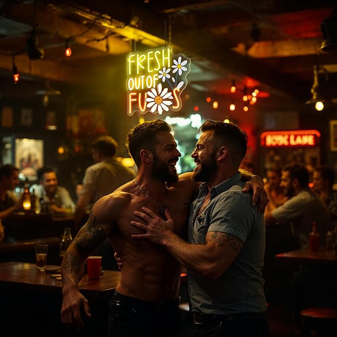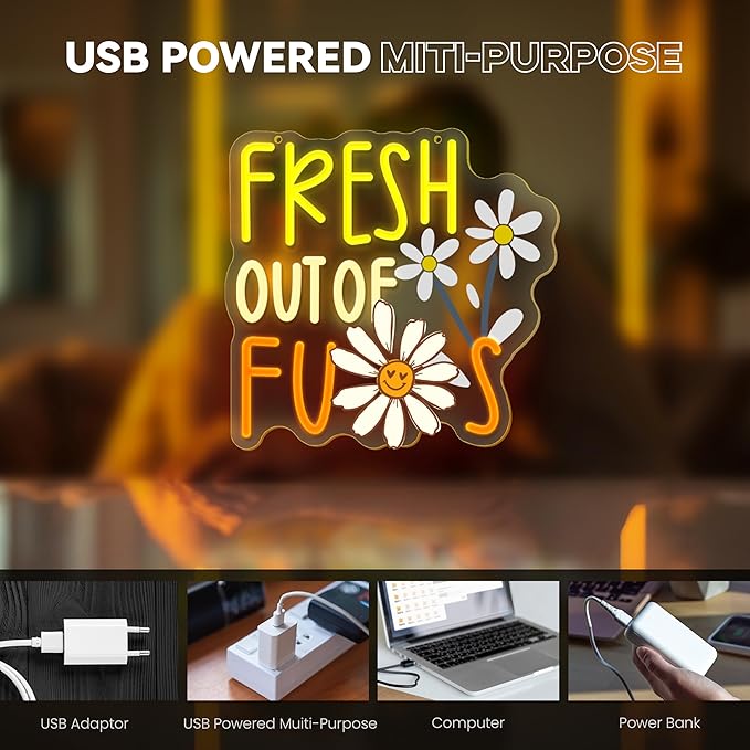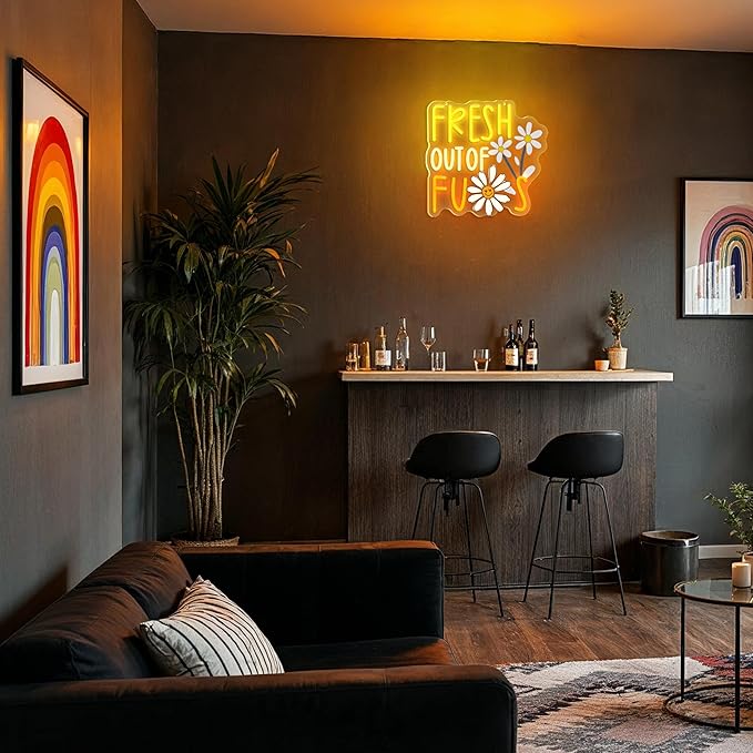 - 【Premium Material】 "FRESH OUT OF FUS" neon light back is made of sturdy and highly transparent acrylic backboard and anti-fall PVC material, the surface adopts the latest LED neon flex technology, the light is soft and uniform, low energy consumption, no risk of overheating or glass damage, long life, safer and brighter than traditional glass neon lights. Handmade to ensure a strong bond.