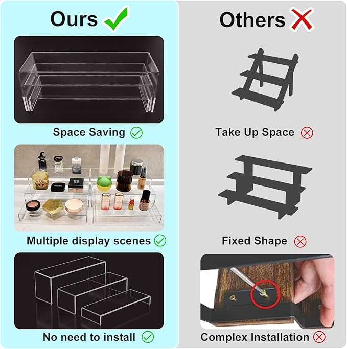 - 【Excellent Visual Presentation】: This clear risers display stands is made of transparent food-grade acrylic, which can clearly show what you want to display, sophisticated and stylish. 3 tier risers display stands provide a floating visual effect for the placed items and properly arrange storage.