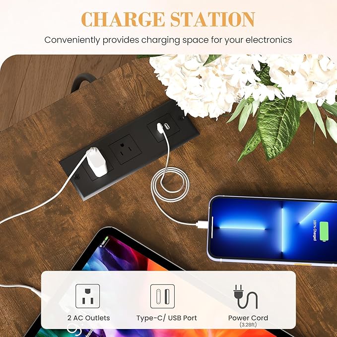 - Built-In Charging Station for Convenience: Stay powered up with the integrated charging hub: 2 AC outlets, 1 USB port and 1 Type C port of bedside table let you charge phones, tablets, lamps, and more simultaneously. Keep cables of small desk tidy and devices of end tables living room within reachβno more scrambling for adapters or sacrificing bedside space to clutter