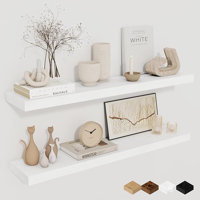 - STYLE & VERSATILITY: Elevate your home with our set of 2 elegant wall shelves, designed for versatile display options. Arrange them side by side for a clean, unified look, or stagger them for a bold, dynamic effect. Adding a touch of sophistication while providing practical storage