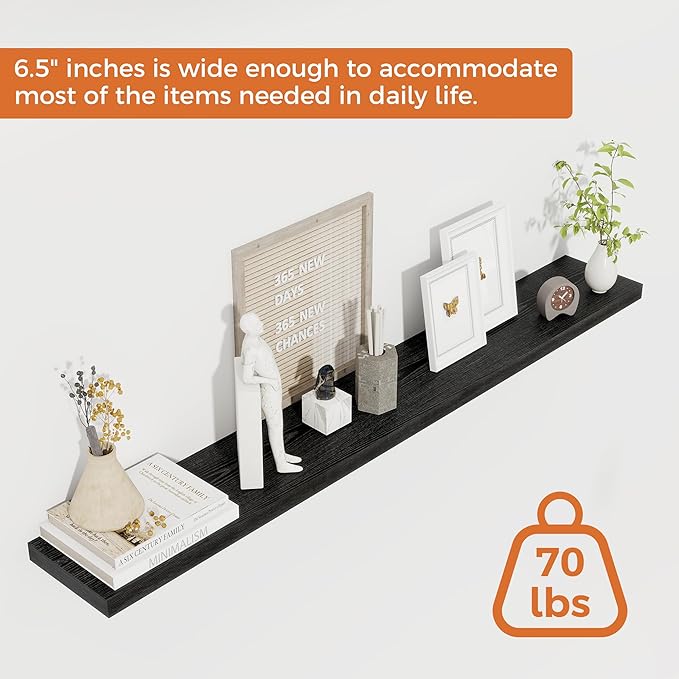 - 48-Inch Floating Shelves for Wall (Set of 2): Each shelf measures 6.5 inches in depth and 1.1 inches in thickness. This 2-piece set offers a more cost-effective and practical storage solution. Fun Memories wall shelves can be installed in a variety of waysâstaggered vertically, side-by-side, or independentlyâto add extra storage and reduce clutter in your kitchen, bathroom, bedroom, and more. Available in multiple colors to suit different decor styles