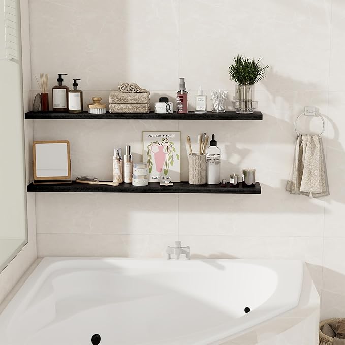 Floating Shelves for Wall, 48 Inch Floating Shelves for Home Decor, Wall Mounted Rustic Wood Shelves, Bathroom, Hanging Deep Shelf for Bedroom, Living Room, Kitchen (Black, Set of 2)
