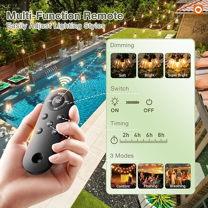 - UPGRADED! Remote Control: Our advanced remote control marries ease with innovation for next-gen solar string lights: 3 Brightness Mode: Soft/Bright/Super Bright, 3 Light Mode: Breathing/Flashing/Constant, 4 Timing Control: 2/4/6/8 Hrs. One remote, endless charmโno extra timers and dimmer required