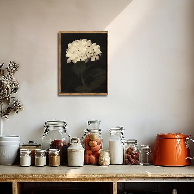 • Framed Canvas Wall Art: This vintage white hydrangea oil painting print adds a touch of botanical elegance to any room. Its classic floral design is ideal for enhancing the ambiance of your living room, bedroom, kitchen, or office with timeless charm.