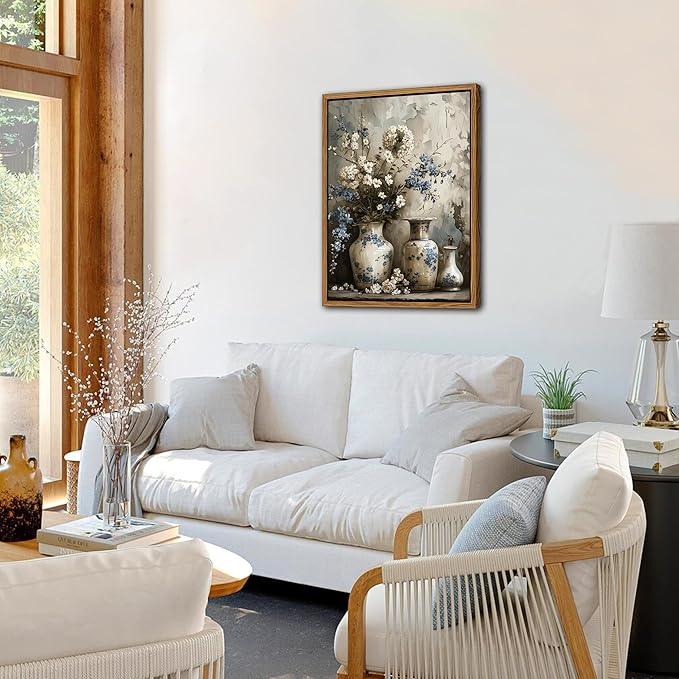 • Framed Canvas Wall Art: This vintage farmhouse floral canvas features elegant blue and white flowers in a charming art jar, capturing a timeless rustic beauty. It’s the perfect accent to enhance your living room, bedroom, bathroom, or any cozy home corner.