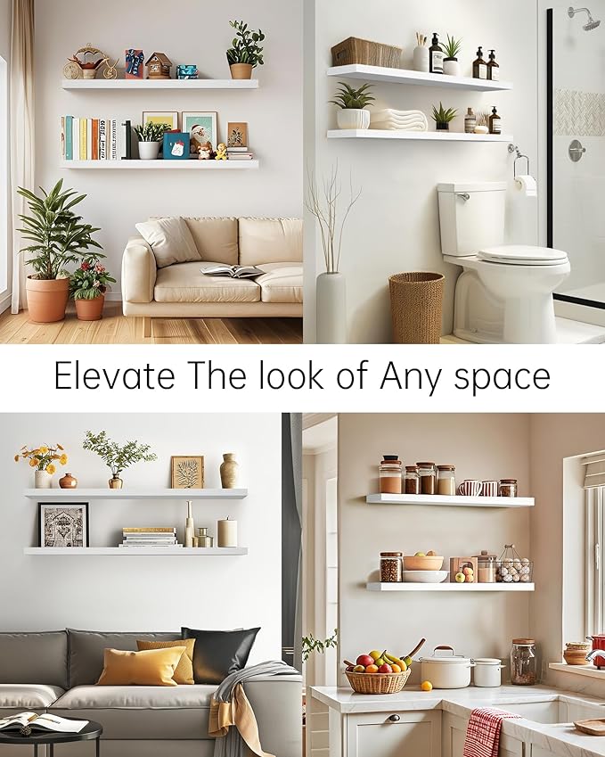 BAYKA Floating Shelves, 48 inches Long Heavy Duty Wall Mounted Rustic Wood Shelves for Bathroom, Bedroom, Living Room, Kitchen, Office, Hanging Shelf for Books/Storage/Decor(White,Set of 2)