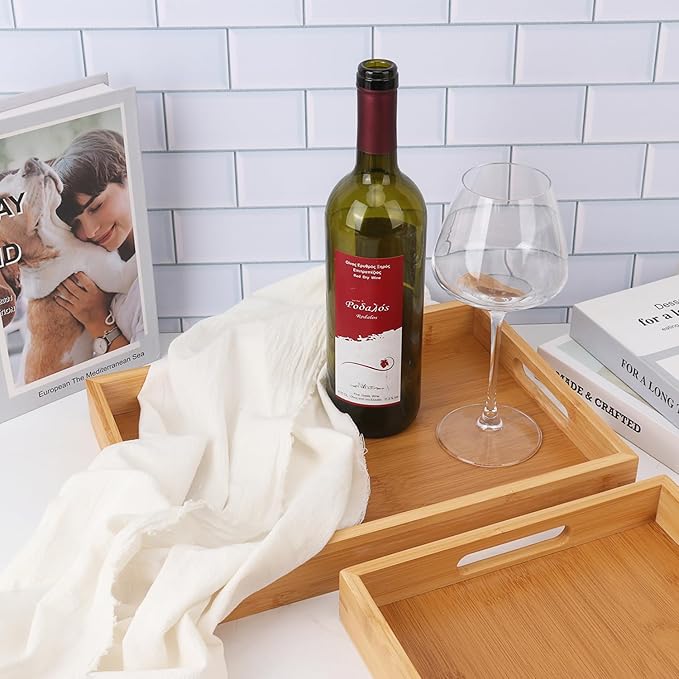• 【Set of 3 Bamboo Trays】This package includes four large bamboo serving trays, adding a touch of natural elegance to your dining and entertaining needs. They are ideal for daily use or special occasions, and can also be a thoughtful housewarming gift.