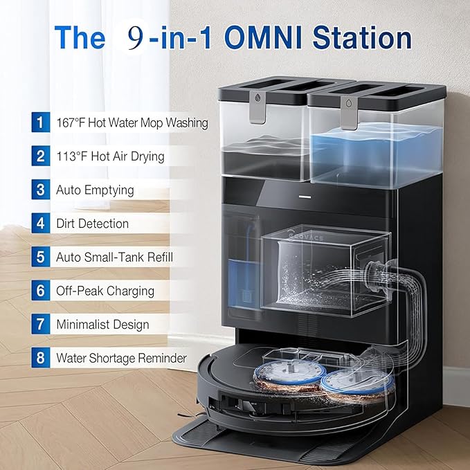 - 10-IN-1 OMNI STATION – HANDS-FREE MAINTENANCE—The OMNI Station handles all maintenance—167°F hot water mop washing, 113°F hot air drying, auto dustbin emptying, water refilling, and dirt detection. It even auto-dispenses cleaning solution, ensuring a deep, hands-free clean every time.