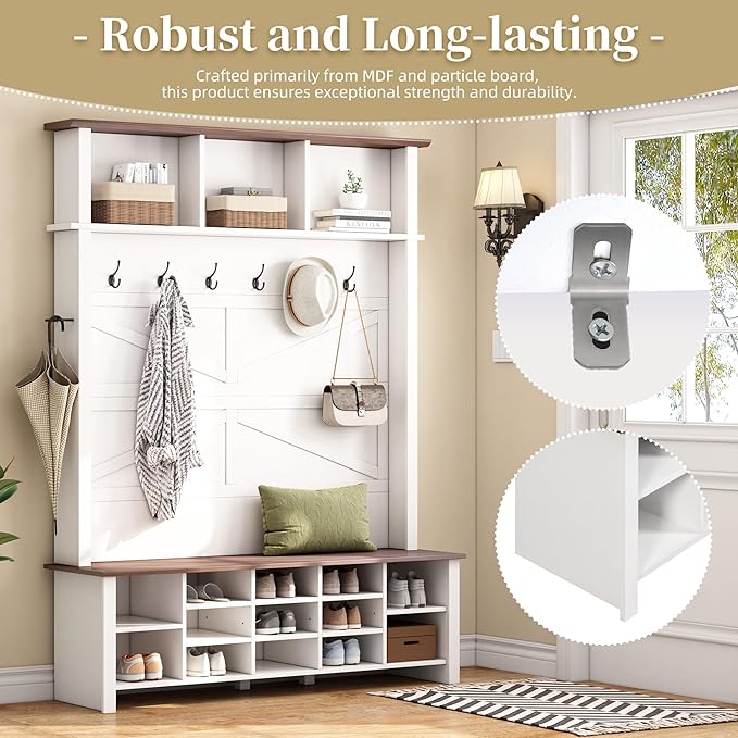 Ball & Cast 4-in-1 Hall Tree with 6 Hooks,Walnut Entryway Bench with Adjustable Shelves,Rustic Shoe Organizer with 16 Open Compartments,for Mudroom,Living Room,Hallway,White
