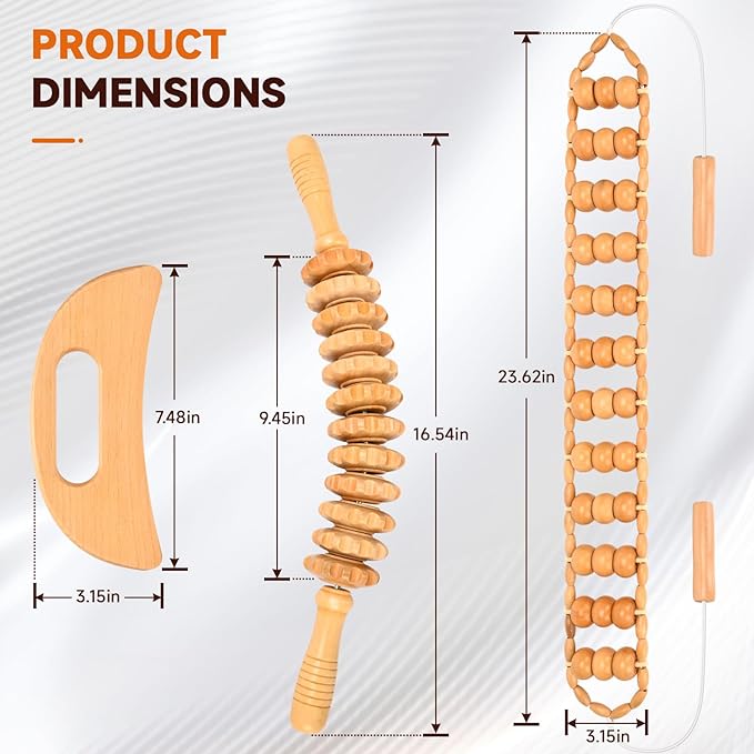 - 3 in 1 Maderoterapia Kit: We put the most effective wooden therapy massage tools in one kit. You will get 1*Massage roller rope, 1*Curved roller massager, 1* Gua Sha Scraping Board. You can get a SPA-level experience to the comfort of your own home with our professional instruction booklet