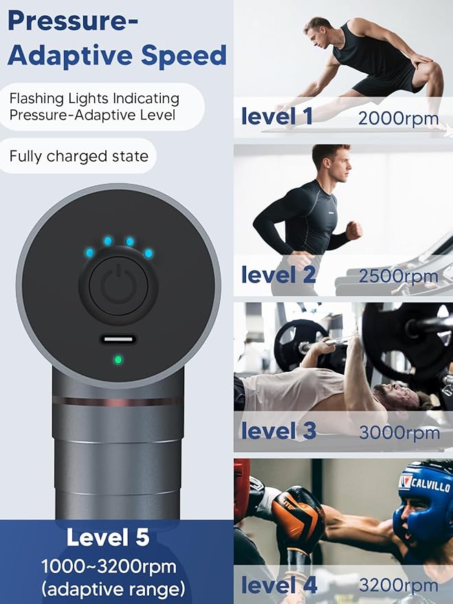 • Pressure-Adaptive Speed Mode: The 5th gear automatically adjusts speed (1000–3200 RPM) based on applied pressure—no manual tuning needed; With five intensity levels, you can personalize your massage for any muscle group with a single button