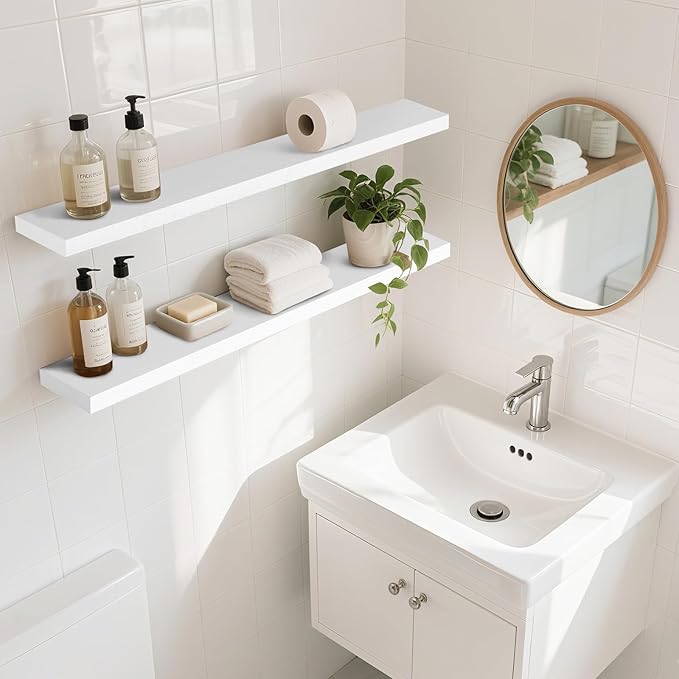 Floating Wall Shelves 2-Pack - 36-Inch Rustic White Wooden Shelves for Storage and Décor, Easy Installation for Living Room, Bedroom, and Kitchen