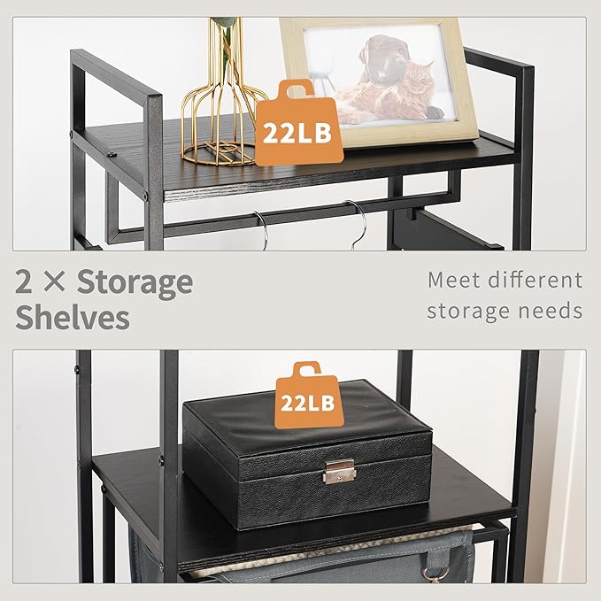 • Great All-in-one Storage Shelf! The organization shelf with laundry hamper, clothes rack, 4 movable metal hooks and hanging rods, makes it is a great shelf organizer in laundry room, coat rack in bedroom, hall tree in entryway and living room