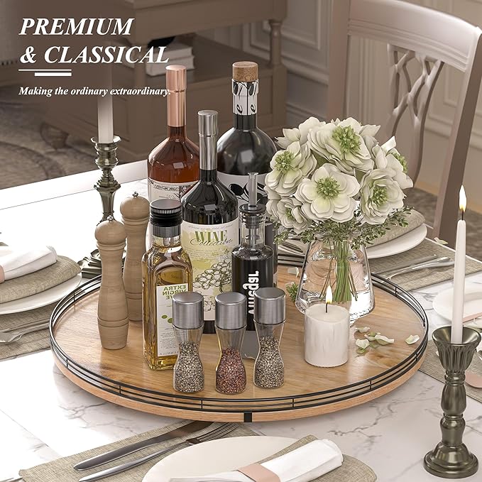 - UPDATED DESIGN: With larger wood base on this lazy Susan for table top, the turntable organizer doesn't wobble, even with heavier items on it. With premium oak wood and classical iron fence make this lazy Susan turntable stylish, functional and adding a touch of rustic charm. itâs also very easy to clean. There are included anti-slip pads on the bottom of the lazy Susan for extra surface protection.