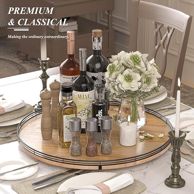 - UPDATED DESIGN: With larger wood base on this lazy Susan for table top, the turntable organizer doesn't wobble, even with heavier items on it. With premium oak wood and classical iron fence make this lazy Susan turntable stylish, functional and adding a touch of rustic charm. itâs also very easy to clean. There are included anti-slip pads on the bottom of the lazy Susan for extra surface protection.