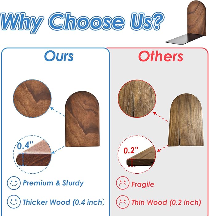 - Natural Black Walnut Craftsmanship: Crafted from black walnut with unique natural grain patternsâno veneers or synthetic dyes, each pair is unique. Thicker wooden bookends are more durable and resistant to drops, adding the breath of nature for your desk.
