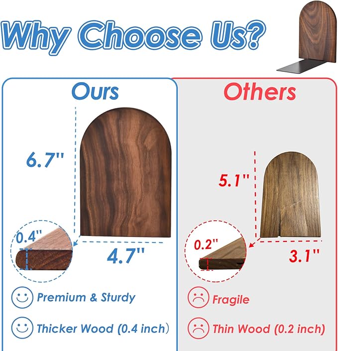 - Natural Black Walnut Craftsmanship: Crafted from black walnut with unique natural grain patternsâno veneers or synthetic dyes, each pair is unique. Thicker wooden bookends are more durable and resistant to drops, adding the breath of nature for your desk.