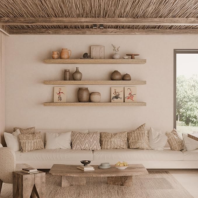 - 【𝐑𝐞𝐚𝐥 𝐰𝐨𝐨𝐝 】These 48 inch floating shelves are made of 100% natural solid wood with iits own wooden node and grain .The texture of this wood floating shelves for wall is very clear,The smooth surface is easy to clean.
