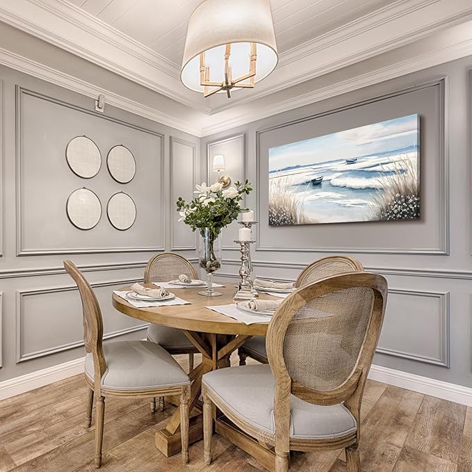 • ➤Tranquil Wall Art for Every Space. Transform your walls with this large stunning coastal canvas art featuring a serene seaside view, gentle waves, and two peaceful boats under a calming sky. Perfect for adding nature-inspired elegance to your bathroom, kitchen, bedroom, or office décor