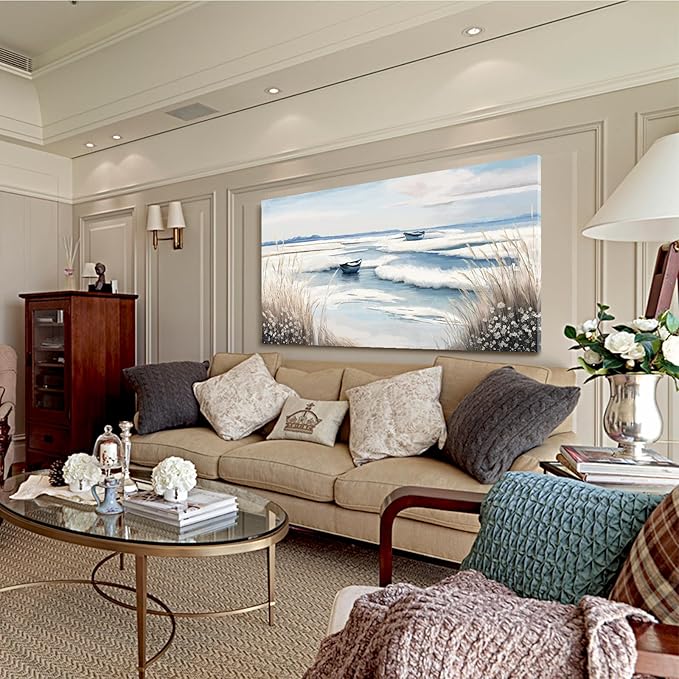 • Modern Coastal Aesthetic – Designed with soft neutral tones of blue, beige, and cream, this large artwork brings a calming and sophisticated coastal vibe to any modern or transitional space.