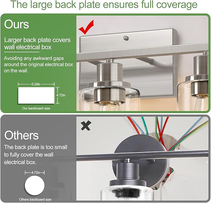 - [Timeless Brushed Nickel Design] Enhance your space with this 3-light bathroom fixture, featuring a brushed nickel metal body and thick clear glass shades. Its sleek, modern design complements farmhouse, contemporary, and traditional decor, making it a versatile and stylish addition to any room.