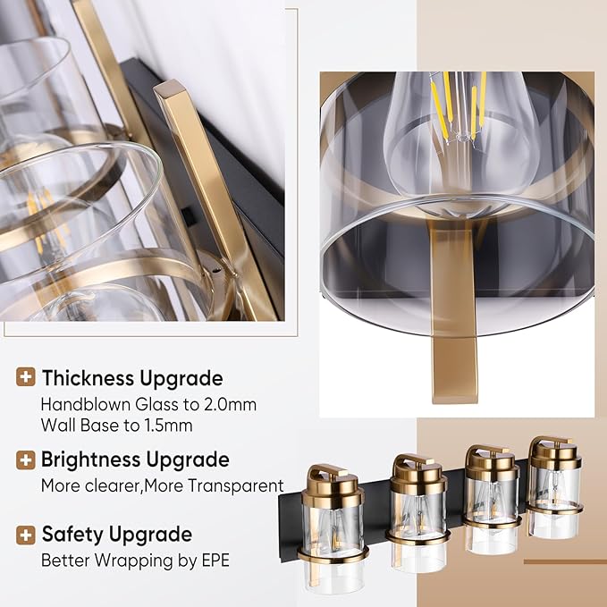 • Product Feature: Hardwired.Black gold bathroom vanity light fixture with clear glass shade;Farmhouse Wall Sconce lighting is easy to install and can be mounted as either up light or downlight.